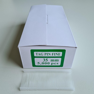 Textielpins, riddersporen, tagpins 35mm fijn doosje met 5000 stuks, materiaal PP en 50 pins per clip.