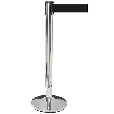 Toegangspaal kleur chroom hoogte 1 meter met zwarte riem, lengte 285 cm, en 1 wandbevestiging. De riem kan ipv aan de wandbevestiging ook aan de volgende toegangspaal bevestigd worden. Het gaat per artikel om 1 paal met riem.